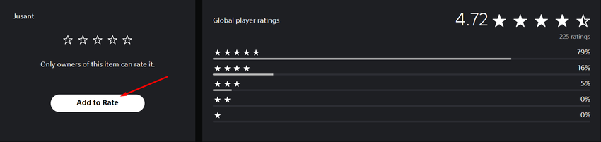 Als je een gamepagina opent in de PS Store-webversie, zie je de algemene beoordeling en hoeveel spelers de game hebben beoordeeld. Om dit te doen, scrol je iets naar beneden op de pagina, waar je het gedeelte "beoordeling" vindt. Klik vervolgens op "Toevoegen aan beoordeling" en geef het spel 1 tot 5 sterren.