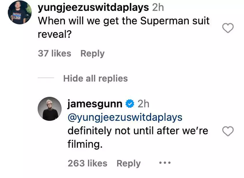 Volgens Gunn zelf zullen fans nog minstens een paar maanden moeten wachten. In antwoord op de vraag van een fan onder een van Gunn's recente Instagram posts, zei de regisseur dat fans niet eens een hint zullen zien van hoe het pak eruit zal zien totdat "Superman: Legacy" begint met filmen.