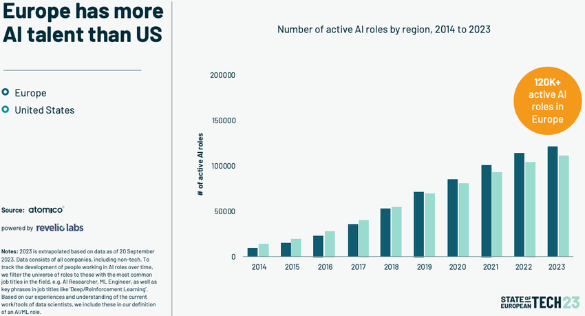 Europa heeft nu meer hoogopgeleid AI-talent dan de VS, volgens een onderzoek van Atomico. In de afgelopen 10 jaar is hun aantal op het continent vertienvoudigd.