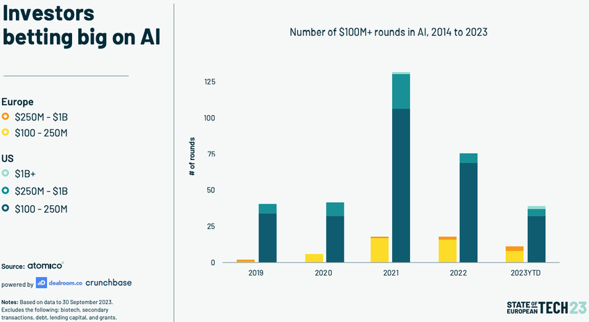 Deze talentenpool blijkt al uit de successen van Europese AI-startups. In 2023 hebben ze 11 van de 36 megafinancieringsrondes van meer dan €100 miljoen in Europa opgehaald, waaronder het Franse Mistral AI (€105 miljoen) en het Duitse Aleph Alpha (€460 miljoen).