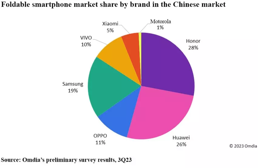 De leider van de Chinese markt is Honor, dat een aandeel van 28% heeft. Het bedrijf verkocht 1,7 miljoen toestellen. Een belangrijke succesfactor was het Magic V2-model, dat goed was voor een kwart van de verkoop in het derde kwartaal van 2023.