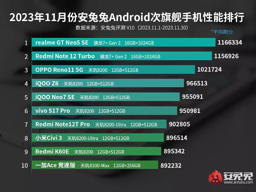Het lot van de eerste plaats werd bepaald door minder dan 10.000 punten. De realme GT Neo 5 SE was de leider en de tweede plaats ging naar de Redmi Note 12 Tubo. Hun scores waren respectievelijk 1.166.334 en 1.156.926 punten. Beide modellen worden aangedreven door de Qualcomm Snapdragon 7+ Gen 2 chip en staan al meer dan een half jaar bovenaan.