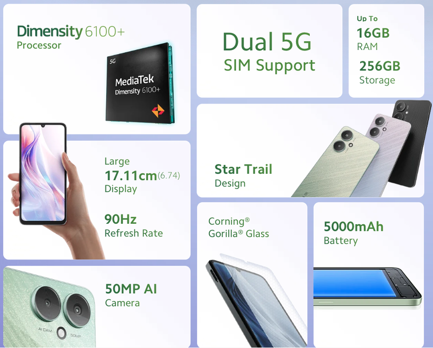 De Redmi 13C 5G wordt aangedreven door de MediaTek Dimensity 6100+ processor in combinatie met LPDDR4x RAM en UFS 2.2 opslag. Het nieuwe product heeft een 5000mAh batterij met 18W opladen (10W voeding inbegrepen), een 50 MP dubbele hoofdcamera en een 5 MP frontcamera. De smartphone wordt geleverd met Dual SIM, 5G, Dual-band Wi-Fi, Bluetooth 5.3, GNSS, USB Type-C poort, zijscanner en 3,5mm jack. Uit de doos is de nieuweling voorzien van het Android 13-besturingssysteem en de MIUI 14-schil.