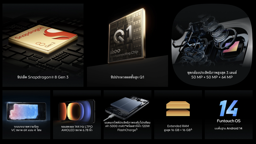 De smartphone maakte zijn debuut in Thailand. De gadget kreeg dezelfde kenmerken als het model voor de Chinese markt. De iQOO 12 5G heeft een OLED-scherm met een framerate van 144 Hz, een diagonaal van 6,78" en een resolutie van 2800×1260 pixels. Het scherm heeft een ingebouwde vingerafdrukscanner. De gadget draait op een Snapdragon 8 Gen 3-chip. Dit is overigens de eerste smartphone op de wereldmarkt met een dergelijke processor aan boord. De SoC wordt geleverd met 16GB RAM en 512GB opslagruimte. De nieuwigheid heeft ook een 5000 mAh batterij met 120W opladen.