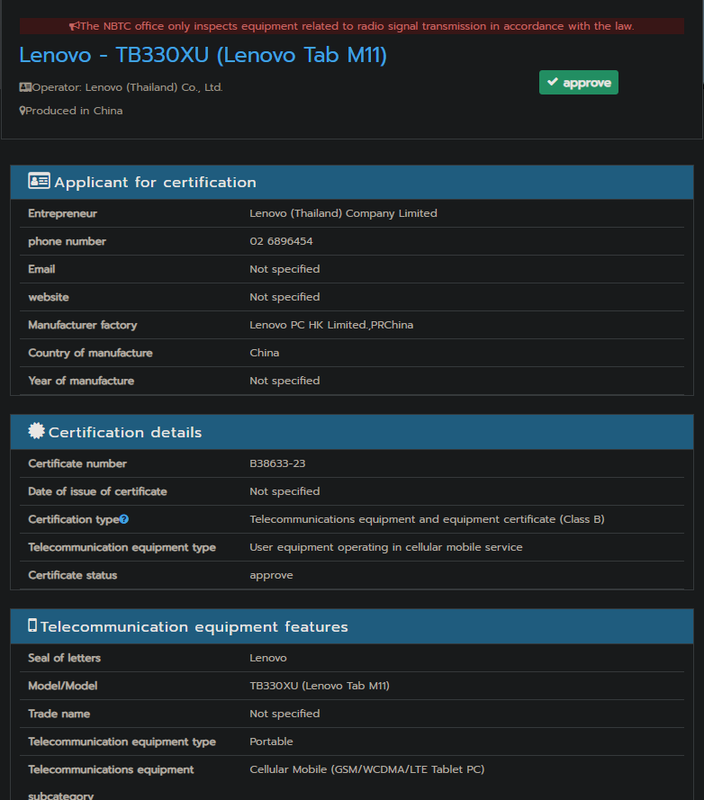Het apparaat met het modelnummer TB330XU is opgemerkt in de database van het certificeringsbureau NBTC. Bijgevolg zal de presentatie van de nieuwigheid in de nabije toekomst plaatsvinden.