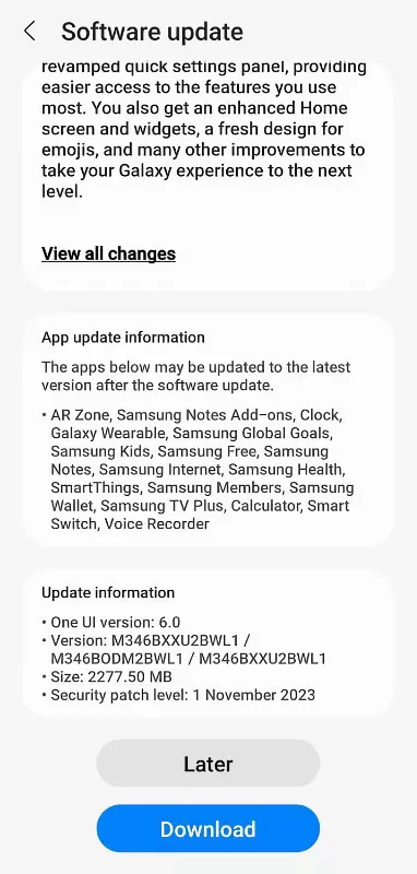 De nieuwe softwareversie is uitgebracht met buildnummer M346BXXUBWL1. Het systeem weegt 2,27 GB en wordt al ontvangen door gebruikers in India. In andere landen verschijnt de OTA binnenkort.