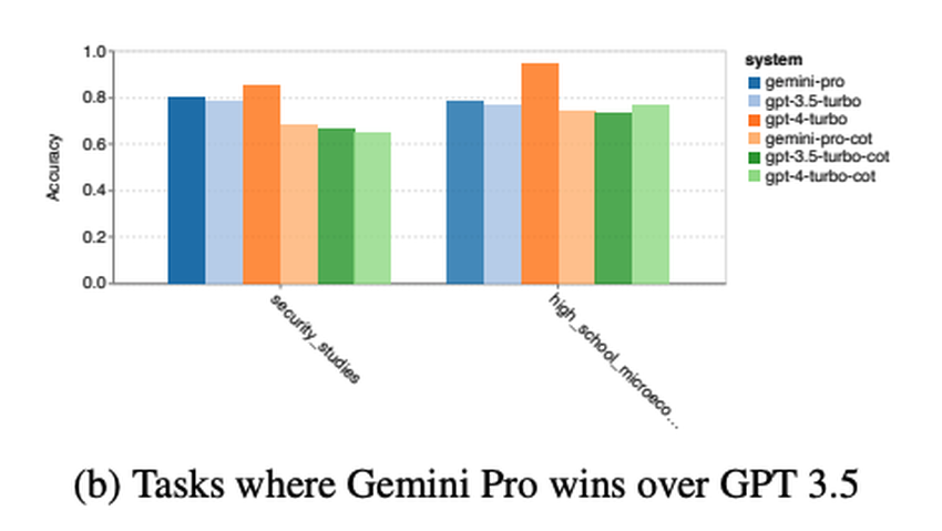 Bij het testen van de modellen op verschillende taken, waaronder meerkeuzevragen over verschillende onderwerpen en logische taken, presteerde Gemini Pro slechter dan GPT-3.5 Turbo. De achterstand was vooral significant op gebieden zoals wiskunde, programmeren en het verwerken van lange complexe vragen.