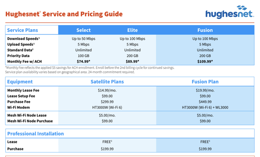 HughesNet-klanten kunnen apparatuur kopen of leasen. De kosten verschillen afhankelijk van het plan. Voor Select en Elite kost de aanschaf $300, terwijl Fusion $450 kost. Huurprijzen zijn respectievelijk $15 en $20 per maand. Als je de apparatuur koopt, moet je bovendien nog eens $200 betalen voor de installatie ervan.