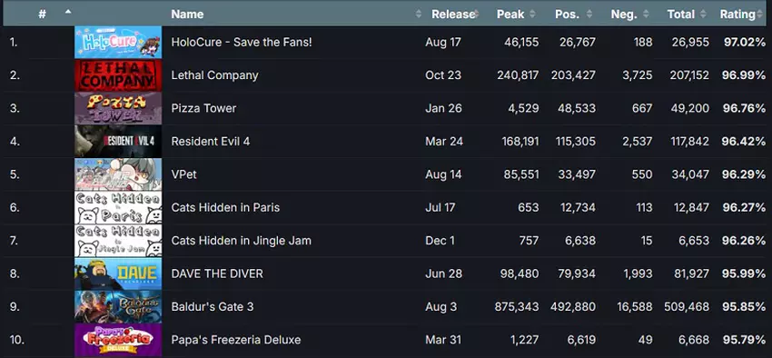 De top is gebaseerd op SteamDB-statistieken en toont de best beoordeelde games, die wordt bepaald door de verhouding tussen positieve en negatieve beoordelingen.