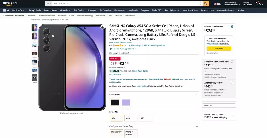 We hebben het over de Samsung Galaxy A54 5G smartphone. De gadget kost momenteel check price on amazon. Als je echter een Prime-abonnement hebt, kun je de prijs van het toestel met 125 dollar verlagen. Overigens was precies dezelfde aanbieding beschikbaar tijdens de Black Friday uitverkoop in november.
