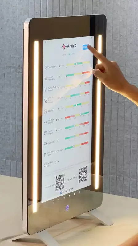 De spiegel is uitgerust met een 21,5-inch scherm en talloze sensoren die het patroon van bloedvaten en aderen op iemands gezicht analyseren. Je hoeft alleen maar voor het scherm te gaan zitten, de aanwijzingen te volgen en 30 seconden stil te blijven zitten. Het systeem scant je gezicht en stuurt de gegevens naar de cloud waar ze worden geanalyseerd. Machine learning-algoritmes analyseren de gegevens om meer dan 100 gezondheidsparameters te bepalen.