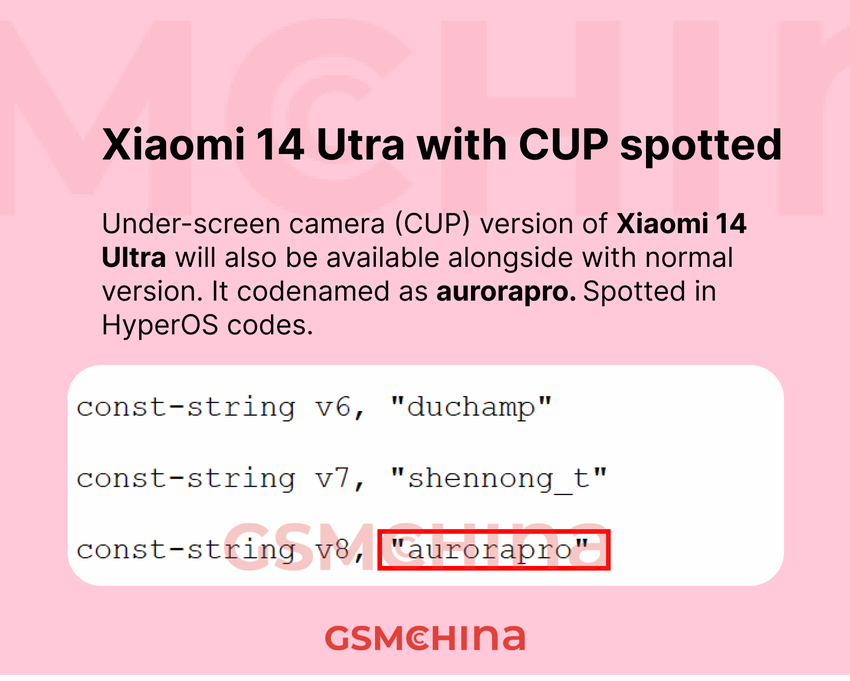 Volgens de bevindingen van de publicatie zal de Xiaomi 14 Ultra twee versies krijgen. De interne codenamen "Xiaomi Suiren" en "aurorapro" horen bij één van deze versies - deze zal een frontcamera onder het scherm hebben. De tweede versie van het vlaggenschip krijgt een gewone selfiecamera.