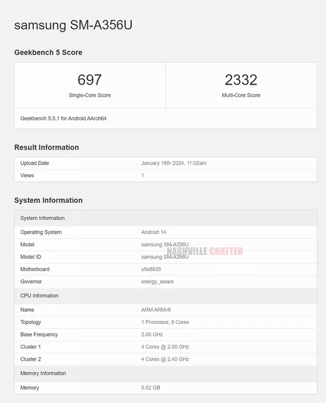De nieuwigheid komt voorbij met het modelnummer SM-A356U. Volgens het rapport wordt de gadget geleverd met 6 GB RAM en het Android 14 besturingssysteem. Daarnaast zeggen de documenten dat de smartphone een eigen Exynos 1380-processor krijgt (moederbordnummer s5e8835). Dezelfde chipset zit overigens in de Galaxy A54, Galaxy M54 en Galaxy F54 modellen van vorig jaar.