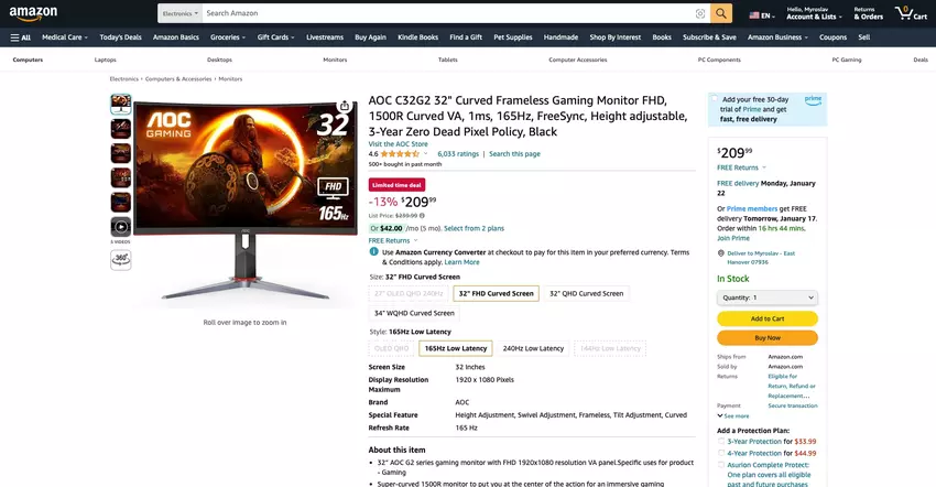 AOC C32G2 op Amazon: 32-inch 165Hz gebogen monitor met $30 korting