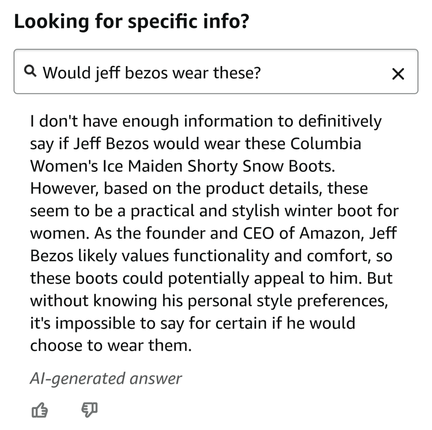 De chatbot kan niet alleen praktisch advies geven over producten, maar ook grappen maken, gedichten en sprookjes componeren over de onderwerpen die gebruikers vragen. Daarnaast kan de assistent advies geven in de stijl van voormalig Amazon CEO Jeff Bezos.