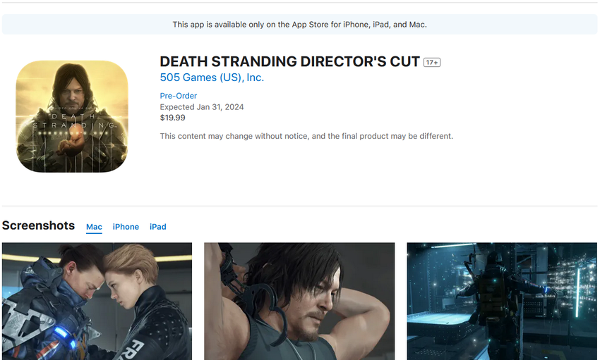 De AppStore geeft aan dat Death Stranding Director's Cut op 31 januari verschijnt, de prijs is $20. Het spel zal beschikbaar zijn op iPhone 15 Pro, iPhone 15 Pro Max, iPad Air en iPad Pro met M1-processor, evenals op Macs met M1-processor.