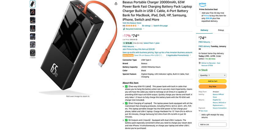 Je kunt nu een uitstekende Baseus-batterij kopen voor een promotieprijs op Amazon. Het apparaat kost check price on amazon.