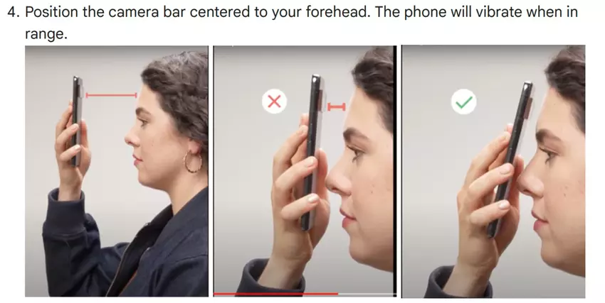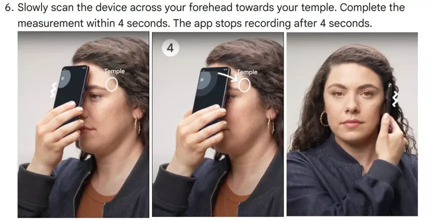 Om de lichaamstemperatuursensor zelf te gebruiken, moet je de telefoon vier seconden langzaam over je gezicht bewegen. De sensor moet zich heel dicht bij de huid bevinden, maar niet in direct contact. Als je een bril draagt, moet je die afdoen, want de telefoon moet zo dicht bij je gezicht zijn dat hij de bril kan raken. Als je met dit alles rekening houdt, krijg je een gemeten lichaamstemperatuur die je kunt opslaan in je Fitbit-profiel.