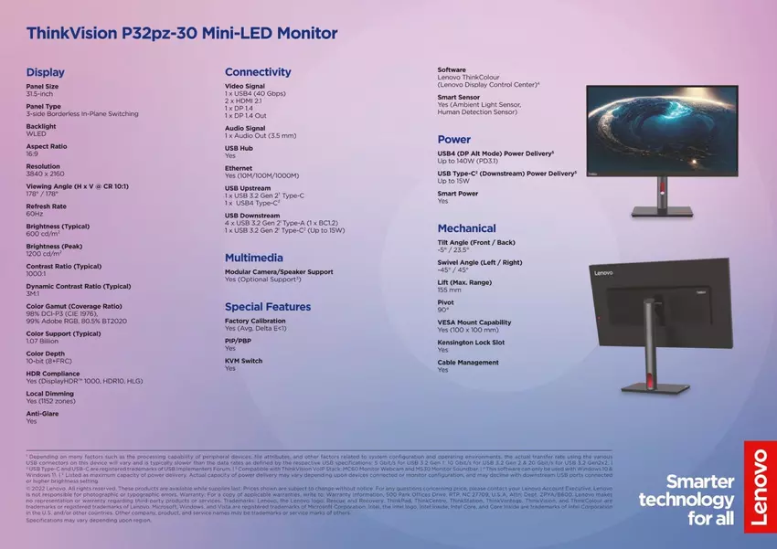 We hebben het over het Lenovo ThinkVision P32pz-30 model. Het apparaat heeft een 31,5-inch mini-LED-scherm met 4K-resolutie, helderheid tot 1200 nits en sRGB-ondersteuning. De monitoren zijn voorzien van HDMI 2.1, USB 4.0 Type-C en DisplayPort 1.4 poorten. De USB 4.0 connector ondersteunt tot 140W uitgangsvermogen (PD 3.1) en gegevensoverdrachtsnelheden tot 40Gbps.