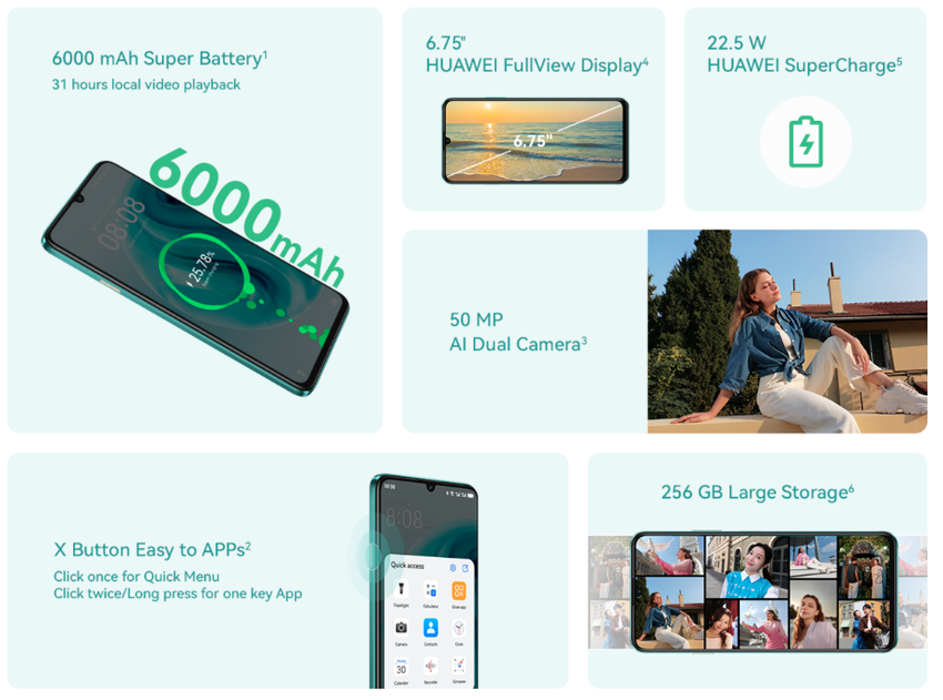 Huawei Nova Y72 is de wereldwijde versie van de Huawei Enjoy 70. De smartphone heeft een 6,75-inch LCD-scherm, een Kirin 710A-processor en een 6000 mAh batterij. De gadget ondersteunt 22,5 W opladen. De nieuwigheid heeft een dubbele 50 MP + 2 MP hoofdcamera en een 8 MP frontcamera. De smartphone wordt geleverd met een X Key-knop aan de linkerrand. Deze kan worden toegewezen aan verschillende acties.