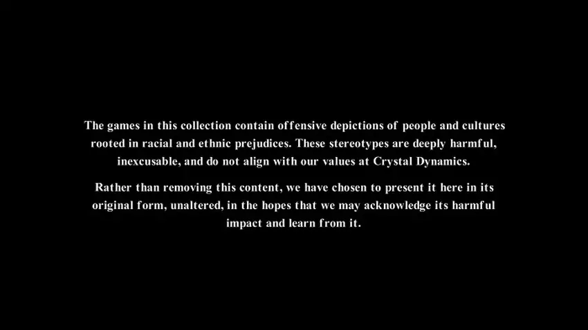 De games in deze compilatie bevatten beledigende afbeeldingen van mensen en culturen gebaseerd op raciale en etnische vooroordelen. Deze stereotypen zijn zeer schadelijk, onvergeeflijk en niet in overeenstemming met de waarden van Crystal Dynamics.
