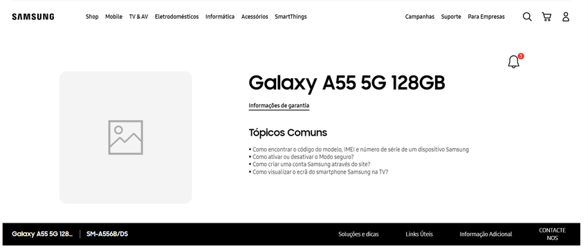 Op de officiële Portugese website van Samsung is een pagina verschenen met de nog niet aangekondigde smartphone Samsung Galaxy A55. De gegevens op de pagina zeggen ons niet veel, behalve het modelnummer SM-A556B en het feit dat kopers van de Galaxy A55 in Europa, of in ieder geval in sommige Europese landen, kunnen kiezen tussen 128 GB en 256 GB opslagruimte.