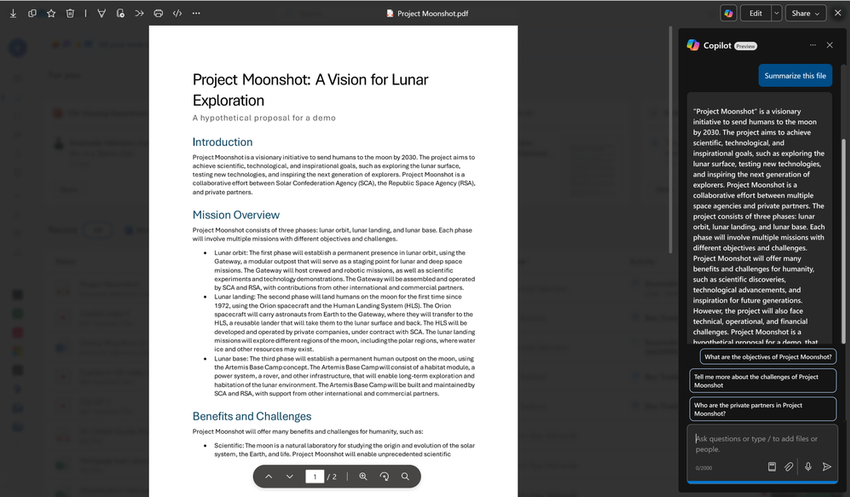 Gebruikers kunnen Copilot opdrachten geven in natuurlijke taal, zoals "een document samenvatten op hoofdpunten" of "een tabel maken met de drankverkoop van de week, opgesplitst per dag". De chatbot zal ook specifieke vragen over de inhoud van bestanden kunnen beantwoorden, voor- en nadelen van projecten kunnen opsommen en recente relevante documenten kunnen markeren.