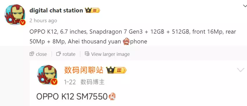 In januari beweerde een klokkenluider van Digital Chat Station dat de Oppo K12 zal worden uitgerust met een Snapdragon 7 Gen 3-chipset. Vandaag heeft dezelfde klokkenluider een nieuw bericht gepubliceerd op Weibo om andere details over de smartphone te onthullen. Hoewel de insider geen lanceerdatum van het toestel noemde, lijkt het erop dat de lancering in China niet lang meer op zich zal laten wachten.