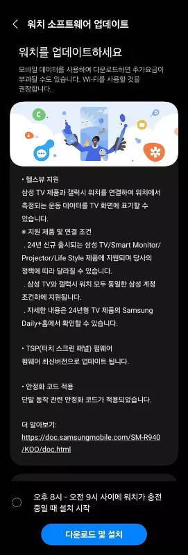 De lijst met wijzigingen bevat de beveiligingspatch van maart. Daarnaast heeft het horloge de mogelijkheid gekregen om workout-informatie naar Samsung TV's te sturen. Bijvoorbeeld de trainingstijd, hartslag, enz.
