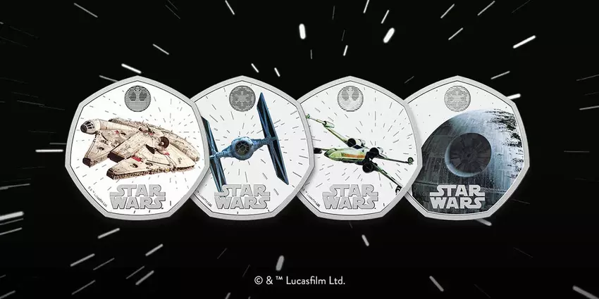 Ze zijn gegraveerd met de Millennium Falcon, de Imperial TIE/ln fighter, de X-wing en de iconische Death Star. Op de achterkant van de munten staat een gegraveerd profiel van de Britse vorst Charles III.