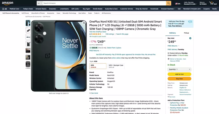 We hebben het over de OnePlus Nord N30 5G smartphone voor $249.99 $299.99, -17%). De gadget wordt verkocht in Chromatic Gray kleur en 8/128 GB versie.