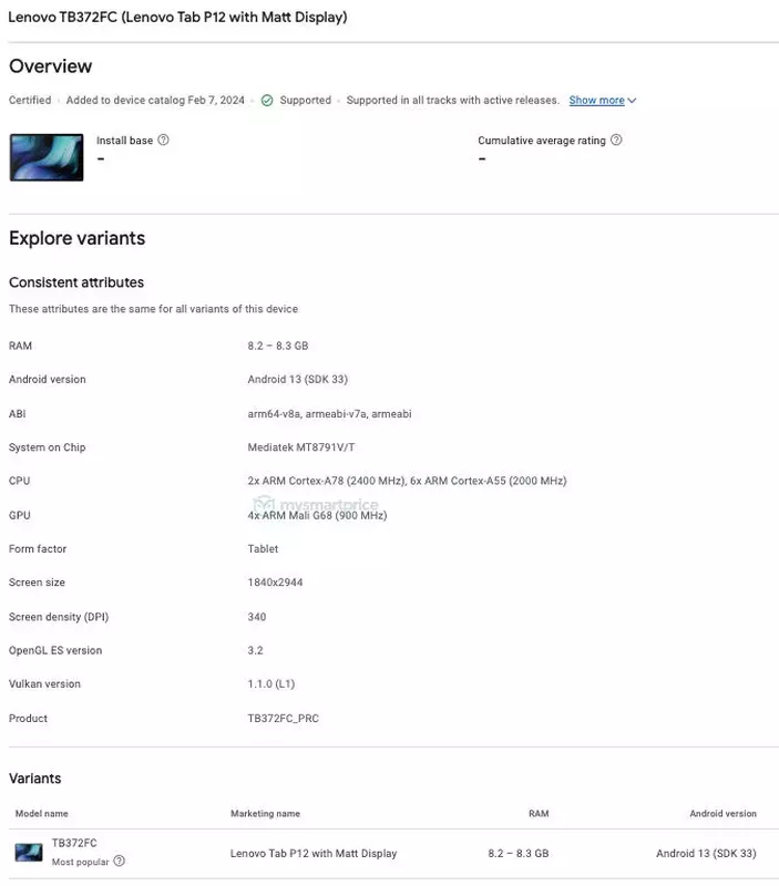 Lenovo Tab P12 Mat Beeldscherm met MediaTek Dimensity 7050-chip is verschenen in de Google Play Console-database
