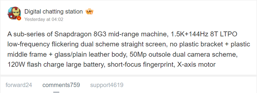 Volgens gegevens van de Chinese insider Digital Chat Station zal de nieuwigheid worden uitgerust met een Snapdragon 8 Gen 3 processor. Daarnaast krijgt het apparaat een LTPO OLED-scherm met een resolutie van 1,5K en een verversingssnelheid van 144 Hz. Het toestel heeft naar verluidt ook een plastic frame en een achterkant van glas of kunstleer, afhankelijk van de kleurversie. De hoofdcamera van het toestel heeft een resolutie van 50 MP.