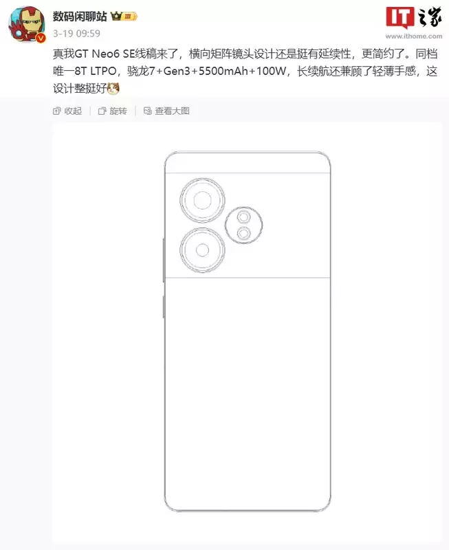 Onlangs is er ook een afbeelding van een klokkenluider van Digital Chat Station online verschenen, waarop een schets van de aankomende GT Neo 6 SE te zien is. Deze schets van de smartphone lijkt qua ontwerp volledig op de vermeende GT Neo 6 SE die op de afbeelding te zien is. De klokkenluider zei ook dat het toestel licht en dun zal zijn, wat ook te zien is op de foto.
