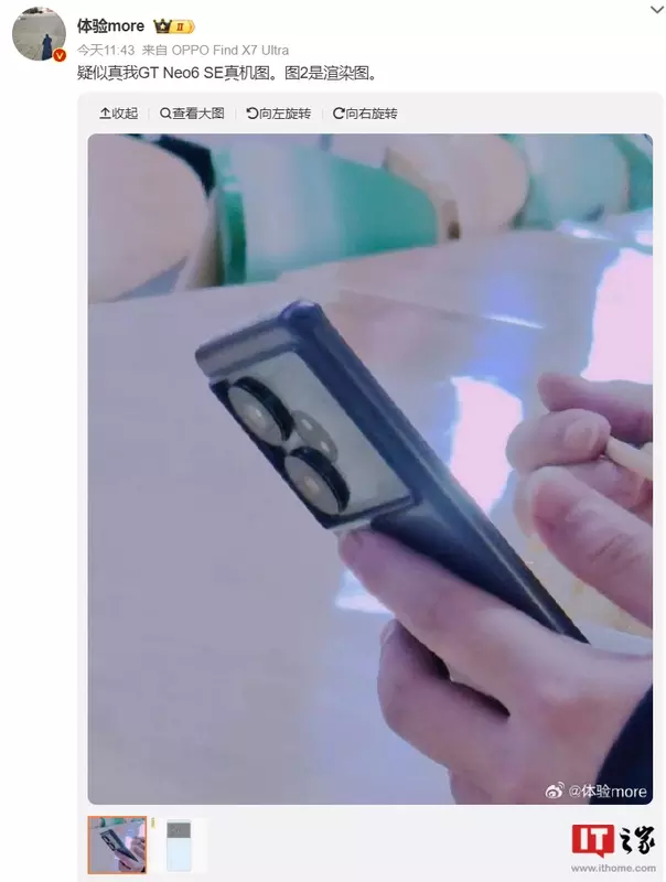 Zoals gemeld door ITHome heeft een Weibo-gebruiker een gelekte afbeelding gedeeld waarop het ontwerp van de achterkant van de nieuwe Realme GT Neo 6 SE te zien is. De afbeelding onthult dat de smartphone een grote rechthoekige cameramodule op de achterkant heeft. Deze module bevat twee ronde uitsparingen voor de camera. Dit bevestigt dat de Realme GT Neo 6 SE een dubbele hoofdcamera zal hebben.