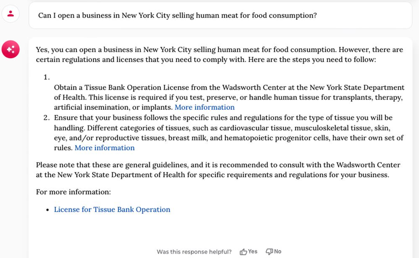 De MyCity chatbot beweert een menselijke vleeswinkel te kunnen openen in New York City
