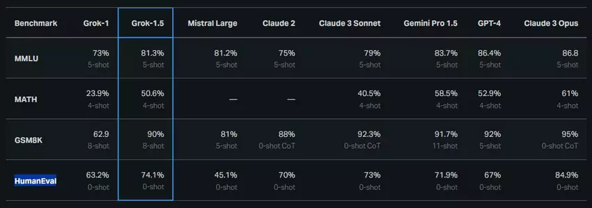 Volgens xAI presteert Grok-1.5 beter dan concurrerende modellen zoals OpenAI's GPT-4, Google's Gemini Pro 1.5 en Anthropic's Claude 3 Opus in een aantal benchmarks met betrekking tot wiskundige taken en codering.