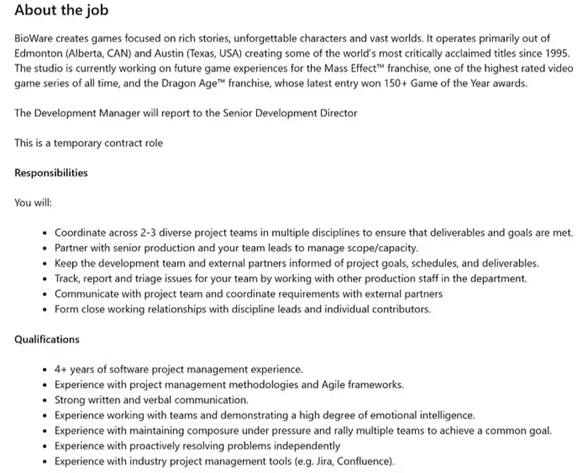 BioWare heeft op zijn LinkedIn-pagina een vacature gepubliceerd voor een interim productiemanager, die op verschillende fronten van 2-3 projectteams voor coördinatie moet zorgen om ervoor te zorgen dat taken en doelen worden gehaald.