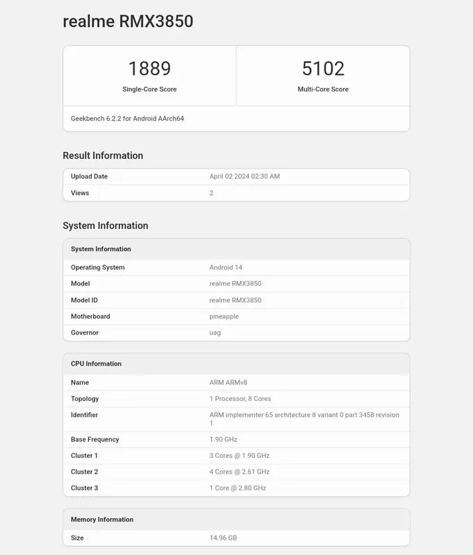 In Geekbench benchmarks scoorde de Realme GT Neo 6 SE respectievelijk 1.889 en 5.102 in single-core en multi-core tests. Aanvullende details van de smartphone in de Geekbench-notering zijn niet onthuld.