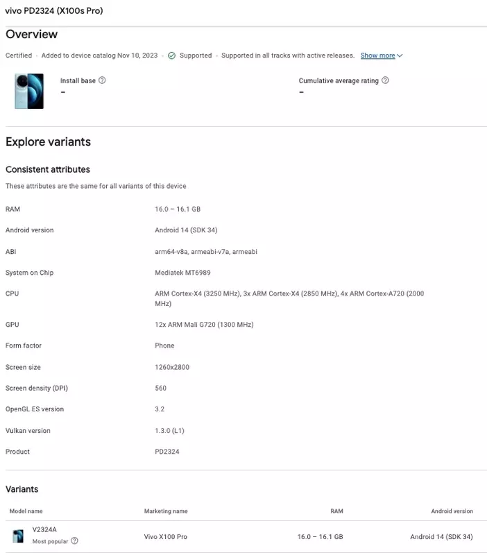 De Vivo X100s Pro is ontdekt in de Google Play Console-database