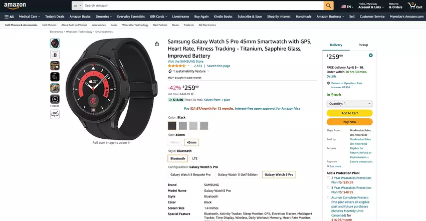 Samsung Galaxy Watch 5 Pro met een 45 mm titanium horlogekast en saffierglas is verkrijgbaar op Amazon met een korting tot $192