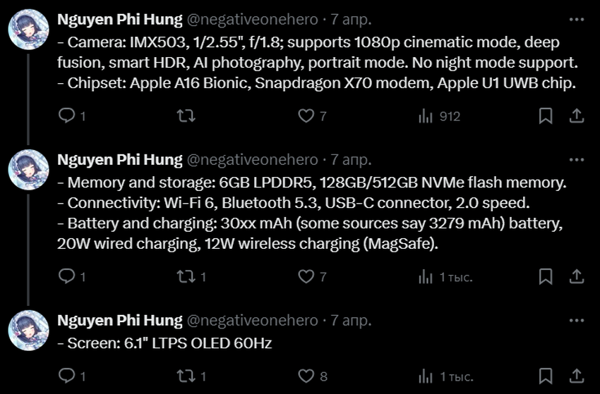 Het toestel wordt aangedreven door de Apple A16 Bionic chip en de Qualcomm Snapdragon X70 modem en Apple U1 UWB chip zullen verantwoordelijk zijn voor de connectiviteit. Het geheugen zal 6GB LPDDR5 RAM zijn met 128GB / 512GB NVMe opslagopties.