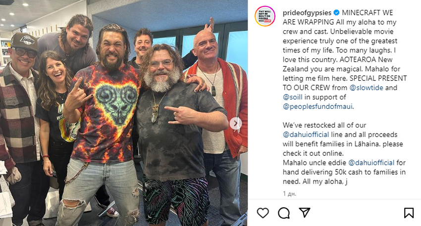 "MINECRAFT WE ARE WRAPPING Al mijn aloha aan mijn crew en cast. Ongelooflijke filmervaring, echt een van de beste tijden van mijn leven. Te veel gelachen. Ik hou van dit land. AOTEAROA Nieuw-Zeeland je bent magisch. Mahalo dat ik hier mag filmen." schreef Momoa onder de carrousel van kiekjes.