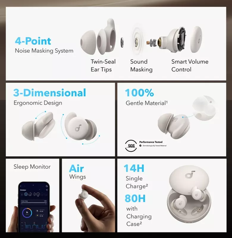 De nieuwigheid kreeg ook dubbele afdichtingen, die de geluidsisolatie verbeteren. Daarnaast heeft het apparaat een actief geluidsonderdrukkingssysteem. Hiermee kun je omgevingsgeluiden met 21 dB verminderen. De hoofdtelefoon wordt geleverd met Bluetooth 5.3. De batterijduur is verhoogd naar 14 uur. Met de Soundcore Sleep case kan de Soundcore Sleep A20 tot 80 uur meegaan.