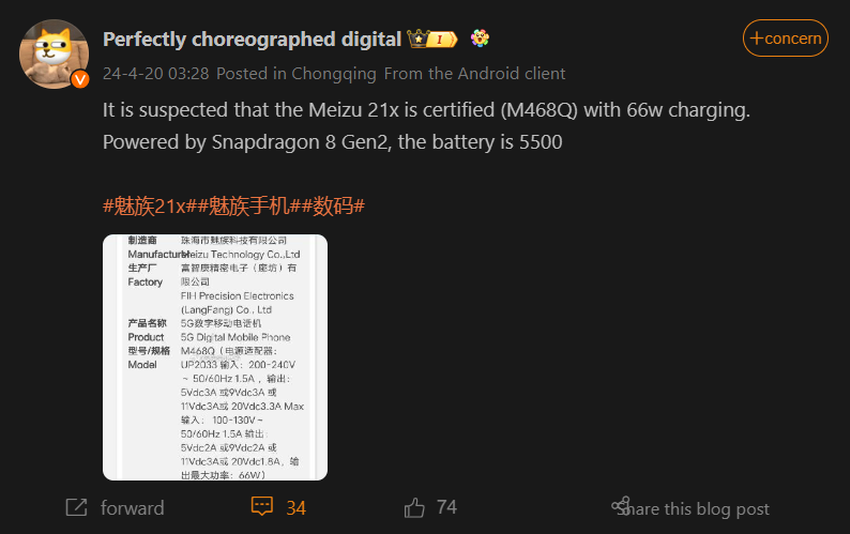 Nu heeft een andere Chinese blogger gedeeld dat het toestel met modelnummer M468Q in de 3C-certificering 66W opladen ondersteunt, wat waarschijnlijk de Meizu 21X is.