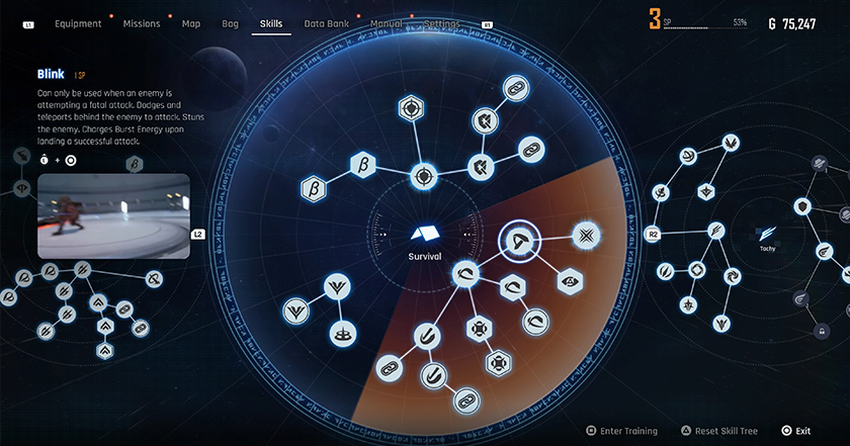 En dan zijn er nog de explosieve vaardigheden. Deze verzamelen zich tijdens een succesvolle parry of dodge. Deze aanvallen zijn nog krachtiger dan de bètavaardigheden. En nogmaals, als je eenmaal een aantal ervan in level hebt, word je niet alleen een storm in de buurt, maar de hele planeet. Mijn favoriete aanval was toen Eva de lucht in vloog en als een dartpijl naar beneden vloog en een explosieve zwaardslag uitvoerde.