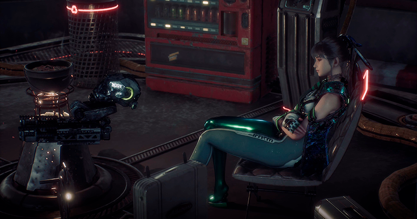 Waar vinden de meeste van deze procedures plaats? In de kampen. Ze zijn verdeeld in twee soorten: eenvoudige, waarbij je het spel kunt opslaan en de winkel kunt gebruiken om je inventaris aan te vullen en nieuwe vaardigheden te ontdekken. En er zijn er serieuzere, waar je je drone kunt levelen, modules kunt upgraden, nieuwe kostuums kunt maken, nieuwe slots voor modules kunt openen (of de eigenschappen van je zwaard kunt verbeteren). En er speelt ook leuke muziek, zodat je op een stoel kunt gaan zitten, naar Aziatische melodieën kunt luisteren, aan kracht kunt winnen en vervolgens de aarde kunt gaan redden, maar eerst moet je deze recensie lezen.