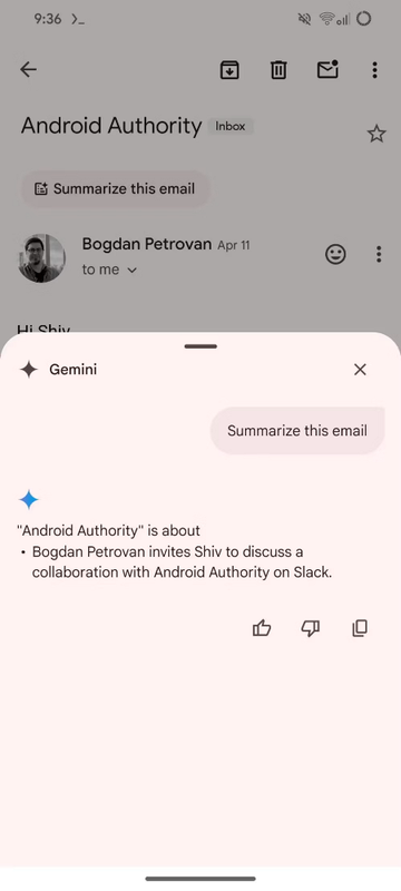 Zodra de optie beschikbaar is, zien gebruikers een knop "Deze e-mail samenvatten" onder de onderwerpregel van hun e-mails. Als ze hierop klikken, wordt een snelle samenvatting van de e-mail gegenereerd. Dit is vooral handig voor lange e-mails met veel tekst en andere details. Je kunt ook de kwaliteit van de samenvatting beoordelen door op de knoppen "vind ik leuk" en "vind ik niet leuk" onder de samenvattende tekst te klikken. Dit zal Google waarschijnlijk helpen om de samenvattingsmogelijkheden in Gemini AI te verbeteren. Je krijgt ook een knop om de samenvatting naar het klembord te kopiëren.