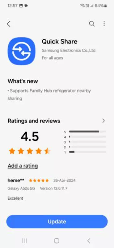 Samsung brengt mogelijk een Quick Share-app uit voor Family Hub-koelkasten waarmee ze bestanden van Android-apparaten kunnen ontvangen via Quick Share, of heeft dit al gedaan. Het bedrijf zou ook de software van de koelkast zelf kunnen updaten om compatibiliteit met deze nieuwe functie te garanderen.