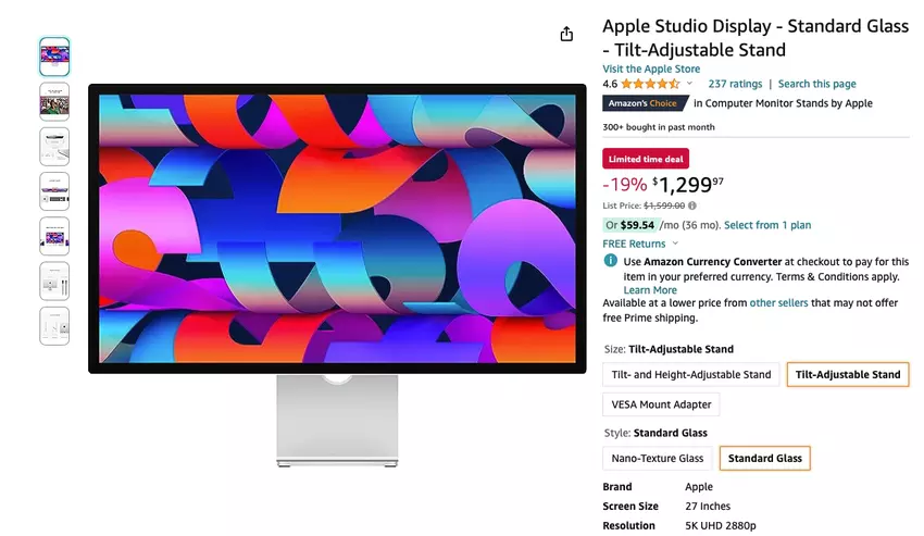 Apple Studio Display bij Amazon: 27-inch beeldscherm met 5K-resolutie, 600 nits helderheid en True Tone-functie voor € 300 korting
